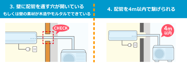 配管4m、配管化粧テープ仕上げ、木造貫通1ヶ所、プラブロック、真空引き、ドレンはジャバラホースにて垂れ流しとなります。