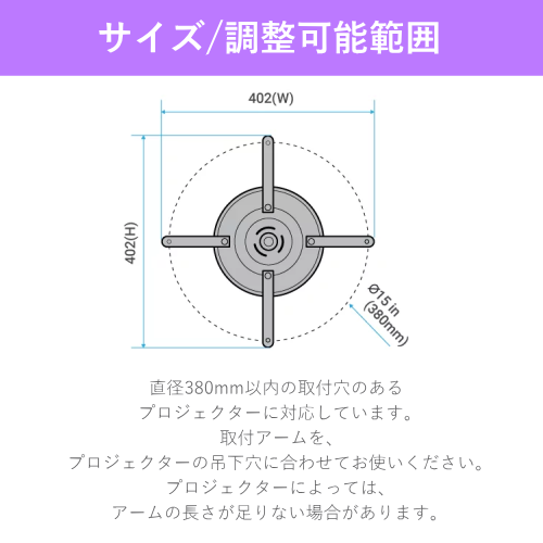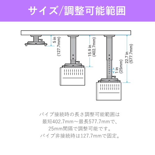 127.7 mm(パイプ非接続時), 402.7 mm~577.7 mm(パイプ接続時、25 mm間隔で調整可能)