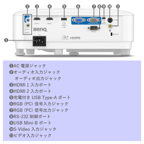 HDMI入力×2(HDMI1.4)、USB Type-A 端子×1、USB Mini-B×1、RS232 (9ピン)入力×1