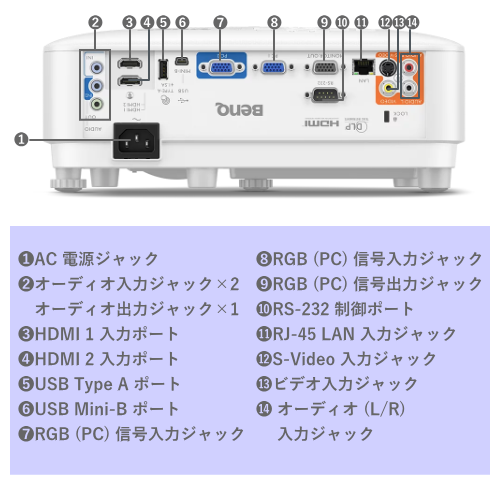 HDMI入力×2(HDMI1.4)、USB Type-A 端子×1、USB Mini-B×1、RS232 (9ピン)入力×1