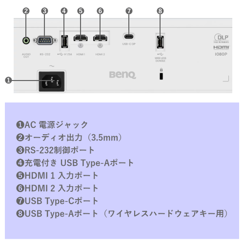 HDMI入力(HDMI1.4)×2、USB Type-A 端子×2、RS232 (9ピン)入力×1