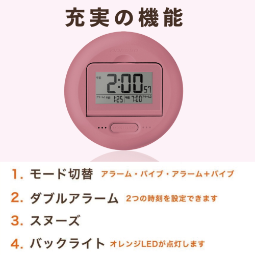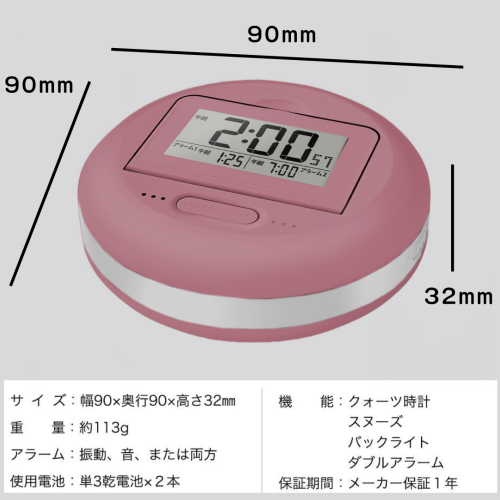 【機能】クオーツ、ダブルアラーム、スヌーズ、バックライト、振動アラーム+音アラーム、またはどちらか