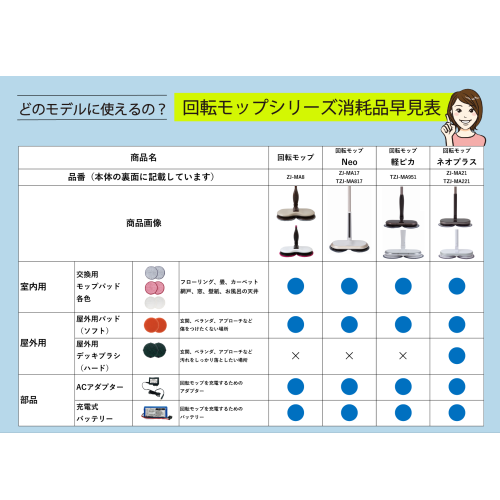 回転モップ(ZJ-MA8)、回転モップ Neo(ZJ-MA17、TZJ-MA817)、回転モップ 軽ピカ(TZJ-MA951)、回転モップ ネオプラス(ZJ-MA21、TZJ-MA221)