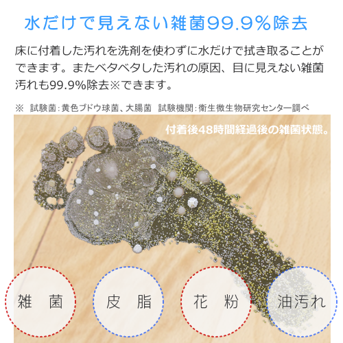 床に付着した汚れを洗剤を使わずに水だけで拭き取ることができます。
